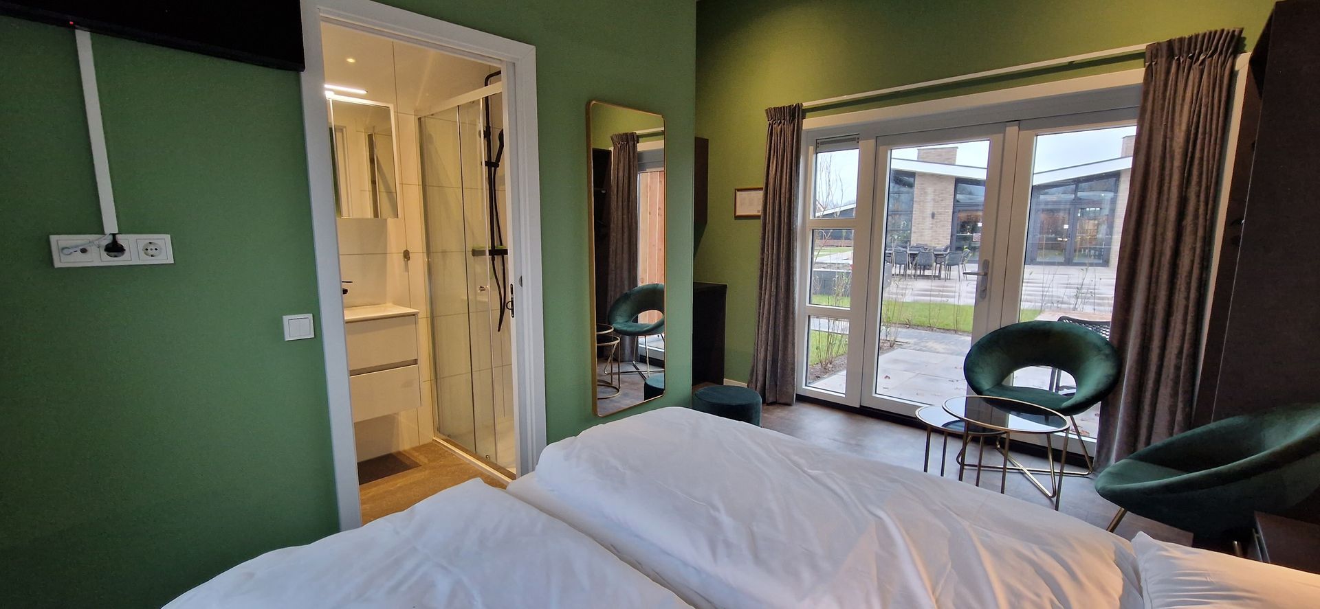 Naast de gezellige ruimtes binnen, kunnen gasten overnachten in de moderne logies die zich naast de Studio bevinden. Iedere kamer heeft een eigen badkamer en biedt veel privacy, zodat iedereen lekker kan uitrusten na een dag vol activiteiten en plezier. Voor grotere groepen kunnen we extra mogelijkheden bespreken, zodat iedereen kan blijven genieten van een zorgeloos weekend.